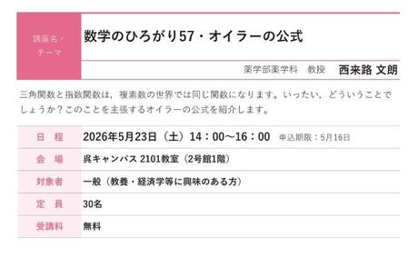 公開講座「数学のひろがり57・オイラーの公式」参加募集中
