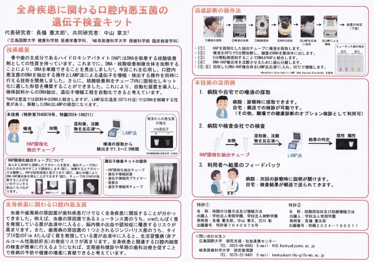また本技術は、医療分野において遺伝子診断・遺伝子検査に活用可能と考えます。特に、健康診断や保健所等で多数の検体を扱う病原菌検査、唾液を入れたチューブを検査機関に郵送する郵送検査への活用が進めば、大きな市場になることが期待されます。生活習慣病に関わる口腔内細菌を早期に見出すことができれば歯科医師指導による口腔ケアができるので疾病発症の予防が期待でき、医療費の削減に繋がる他、QOLの向上に寄与できると考えています。