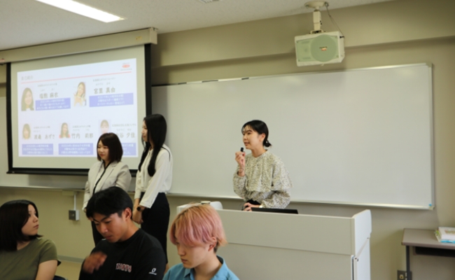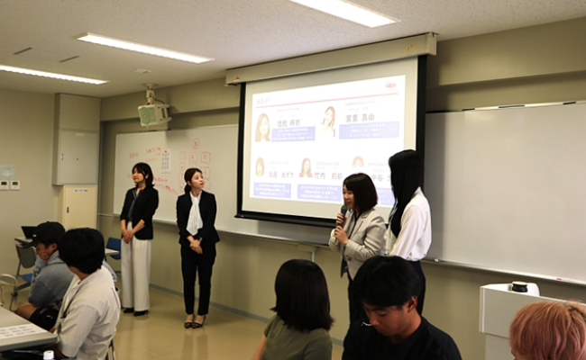 当日は講師として第一生命保険株式会社より、塩飽 麻衣さん、宮里 真由さん、渡邉 あずささん、中谷 夕佳さん、竹内 莉那さんにお越しいただきました。塩飽さん、宮里さん、渡邉さん、中谷さんはいずれも現心理学科の卒業生です。