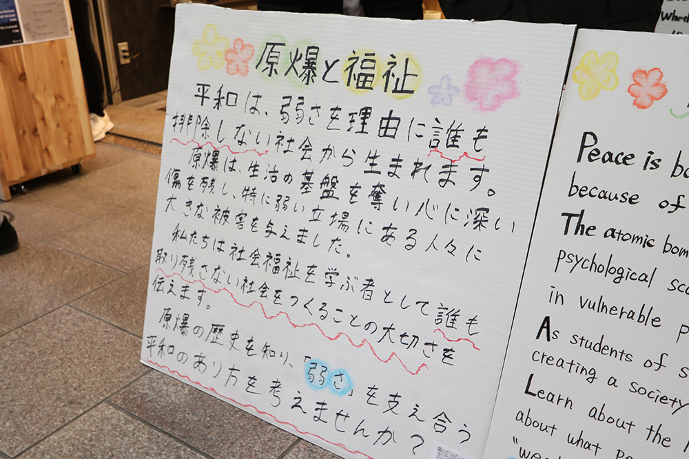 2025年12月13日(土)に社会学科社会福祉学専攻の学生が主体となり、障害者や難病当事者、市民、国内外の観光客が交流できる場をつくり、被爆樹木を持ち帰る体験を通して平和の継承を目指す取り組みを実施しました。当日は、ご家族連れや外国人観光客を含む多くの方々にご来場いただき、会場に設置した高さ約2メートルのクリスマスツリー型メッセージボードには、平和への願いが込められたメッセージが次々と書き込まれました。世代や国籍を超えて多くの方が平和への思いを共有する姿が見られ、学生たちにとっても大きな学びとなりました。