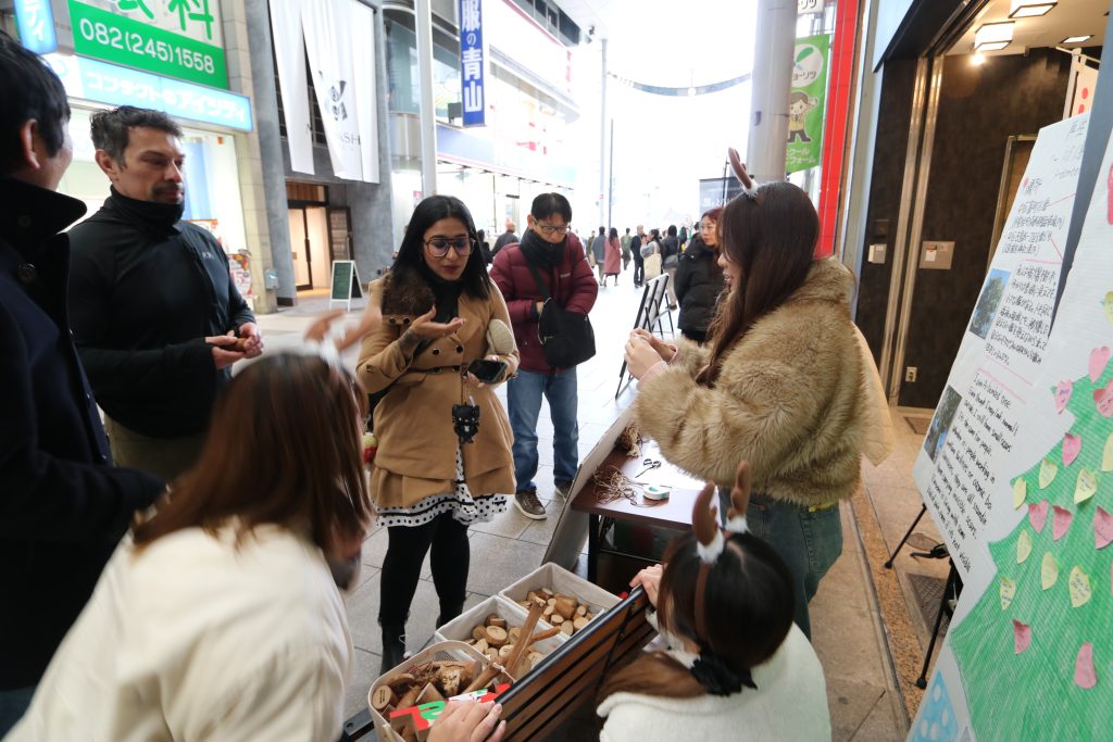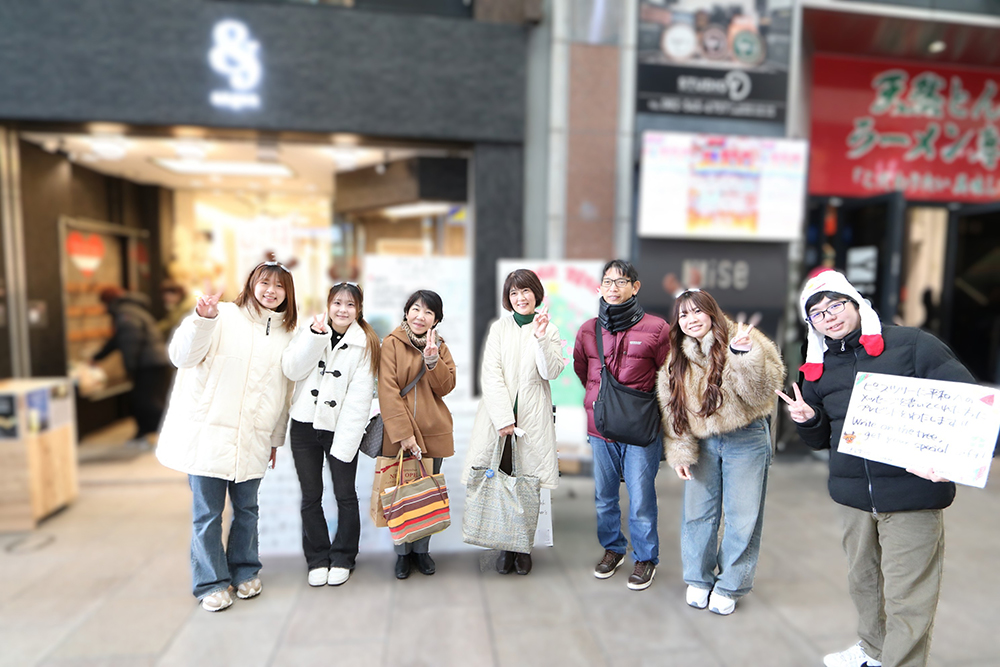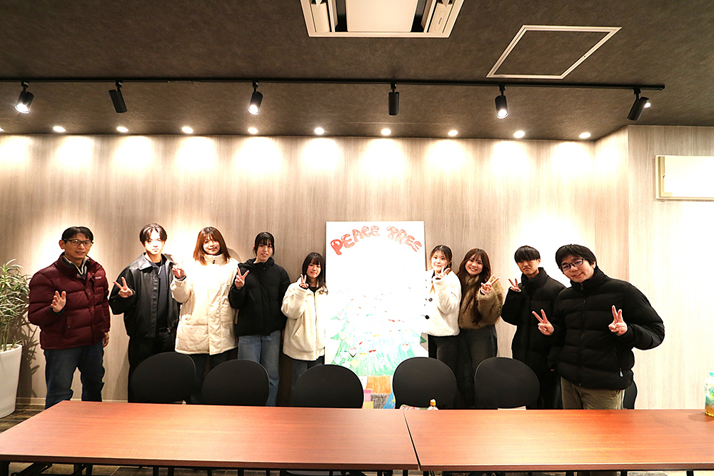2025年12月13日(土)に社会学科社会福祉学専攻の学生が主体となり、障害者や難病当事者、市民、国内外の観光客が交流できる場をつくり、被爆樹木を持ち帰る体験を通して平和の継承を目指す取り組みを実施しました。当日は、ご家族連れや外国人観光客を含む多くの方々にご来場いただき、会場に設置した高さ約2メートルのクリスマスツリー型メッセージボードには、平和への願いが込められたメッセージが次々と書き込まれました。世代や国籍を超えて多くの方が平和への思いを共有する姿が見られ、学生たちにとっても大きな学びとなりました。
