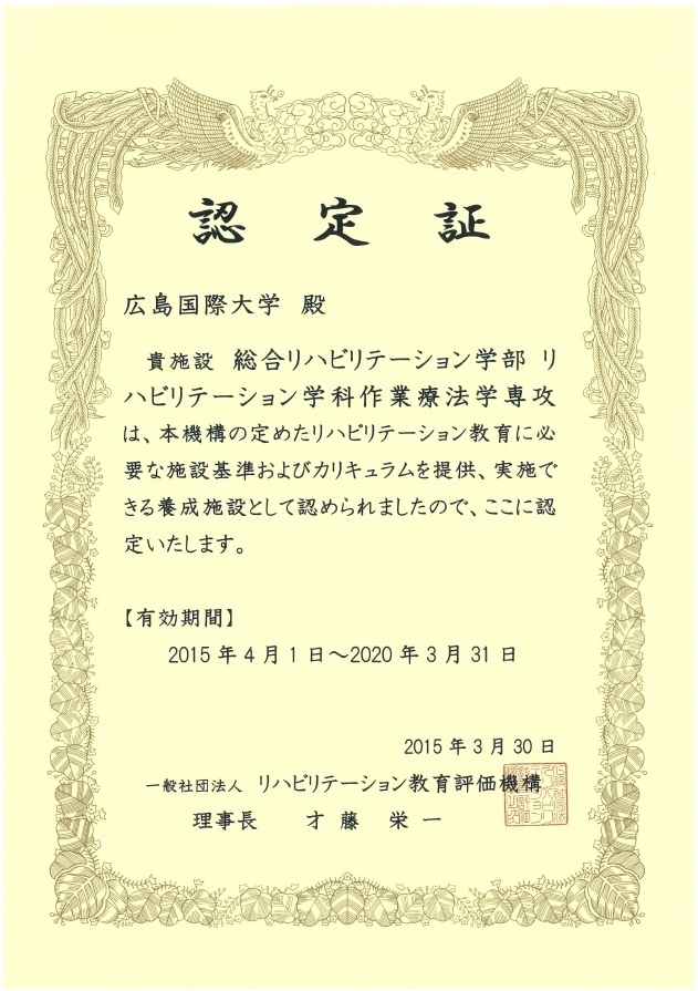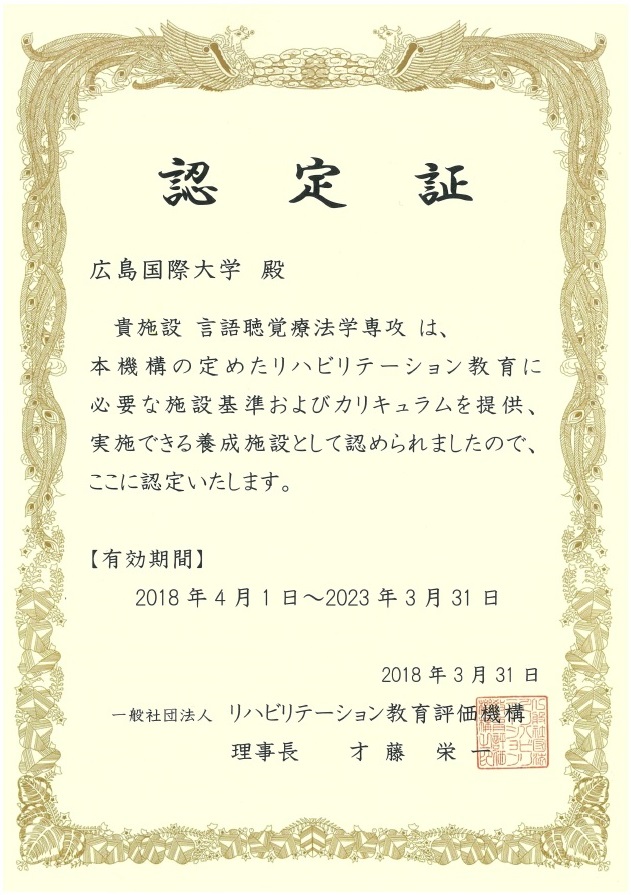 この度、総合リハビリテーション学部 リハビリテーション学科 理学療法学専攻・言語聴覚療法学専攻・作業療法学専攻が一般社団法人リハビリテーション教育評価機構に評価申請を行い、2018年(平成30年)3月に適正な養成施設として認定されました。※作業療法学専攻は2015年(平成27年)3月に認定済