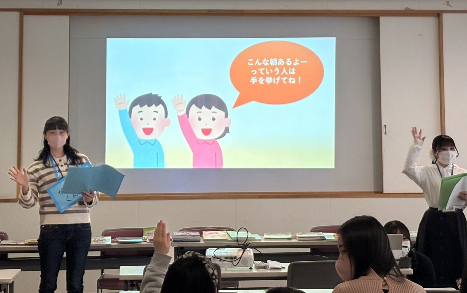 その中で、「Aくんのように夜遅く寝て、なかなか起きれないことがある人はいるかな?」と問いかけると、所々で手を挙げている子ども達が多く見られました。