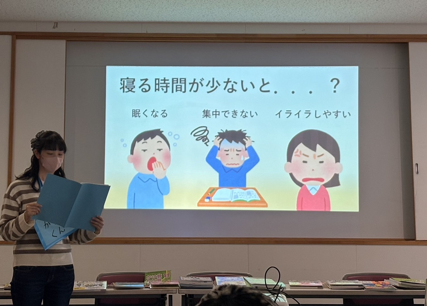 また、その後に、睡眠時間が少ないと実際にどのようなことが起きるのかについて、下記の写真のようにスライドを用いながら説明しました。