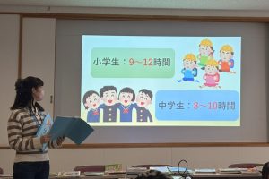 そして、文部科学省の調査をもとに、全国の小・中学生が何時ごろに寝ているのかを、グラフを用いながら説明しました。さらに、小・中学生には本当はどれくらいの睡眠時間が必要なのかということも発表してもらいました。中には「8時間」などと答えてくれる子もいましたが、実際には小学生は9〜12時間、中学生は8〜10時間の睡眠が必要であることを聞いて、子ども達はとても驚いていまいした。