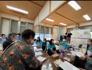 ビンゴゲームの後は、自己紹介をしました。学生は、名前、学科・学年、出身地、趣味、好きな食べ物を紹介しました。参加者の皆さんは名前と年齢、趣味・生きがい、長寿の秘訣、大崎上島町の自慢を紹介してくださいました。お互いの自己紹介を通して、大崎上島町の魅力や参加者の皆さんのことを深く知ることができました。