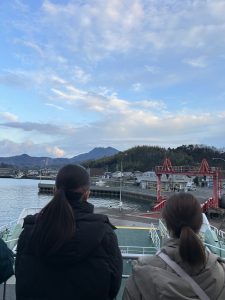 バスで安芸津港へ行き、安芸津港からフェリーで大西港に行きました。フェリーの中では、個人目標を共有しました。