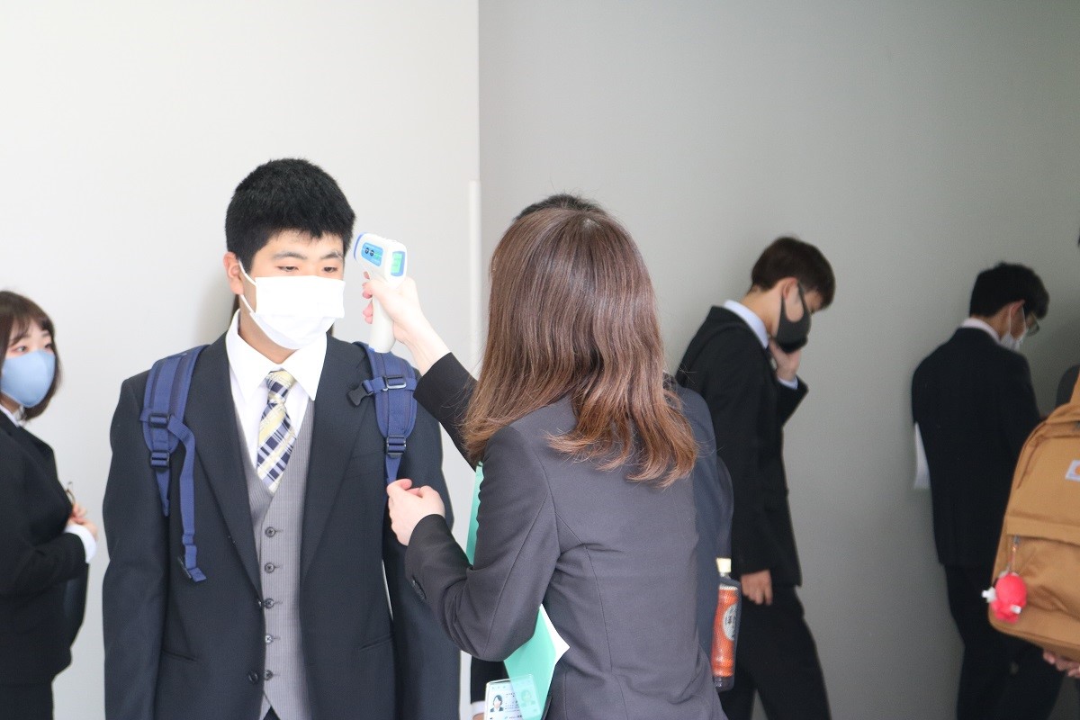 ![]() 受付で検温する新入生 |