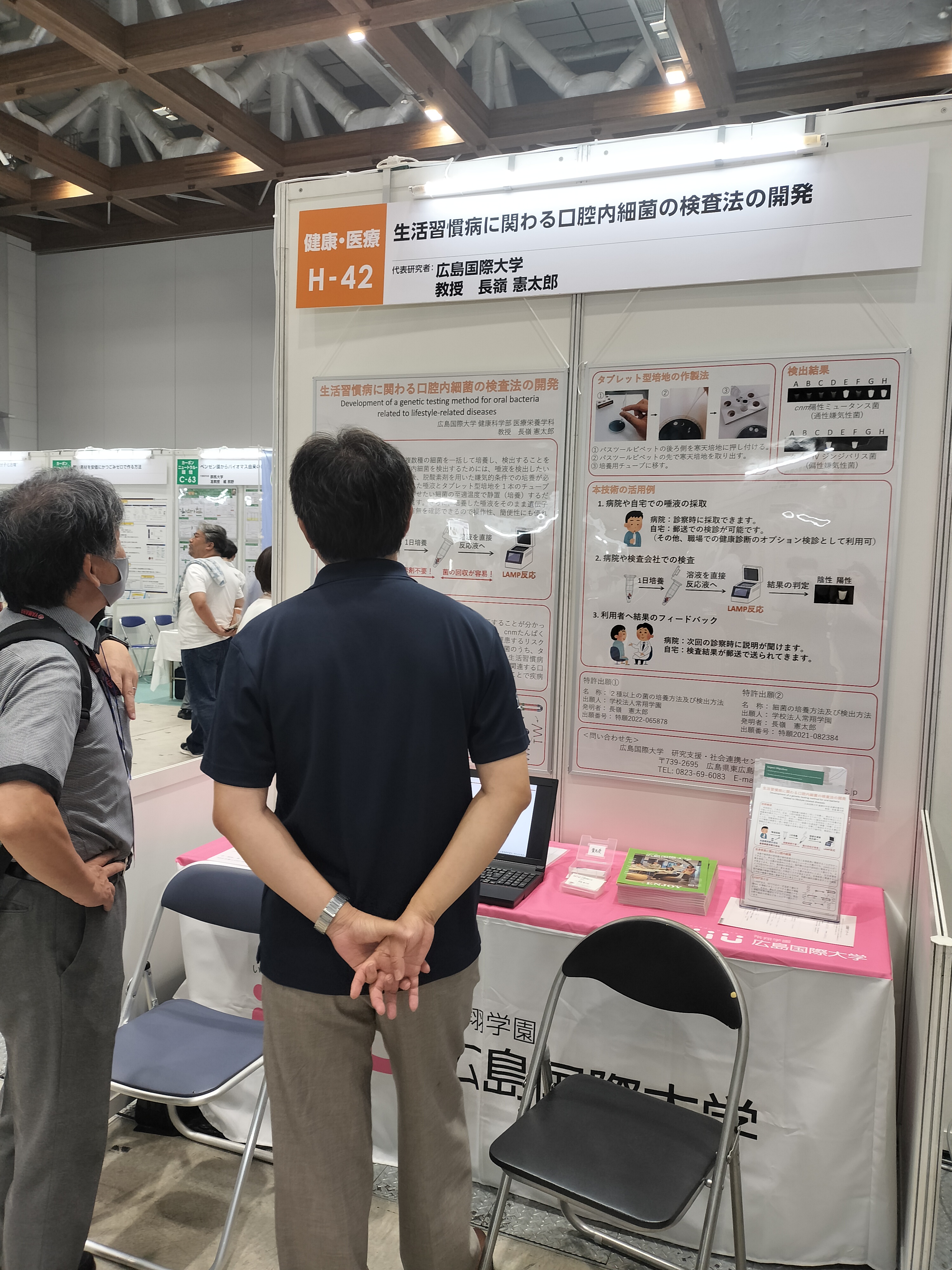 本学からは、2名の教員が出展を行いました。保健医療学部診療放射線学科 山本 めぐみ講師「AI画像生成による物体検知・異常検知」、健康科学部医療栄養学科 長嶺 憲太郎教授「生活習慣病に関わる口腔内細菌の検査法の開発」の2点です。連日多くの方が会場にお越しくださいました。