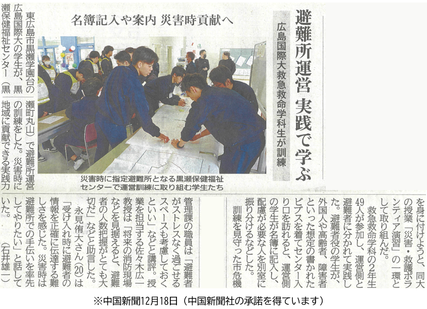 中国新聞 2025.12.13掲載「避難所運営 実践で学ぶ 広島国際大救急救命学科が訓練」の記事が掲載されました。