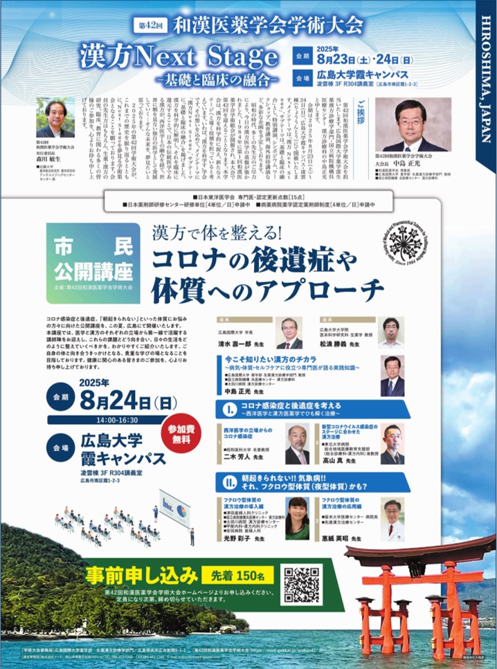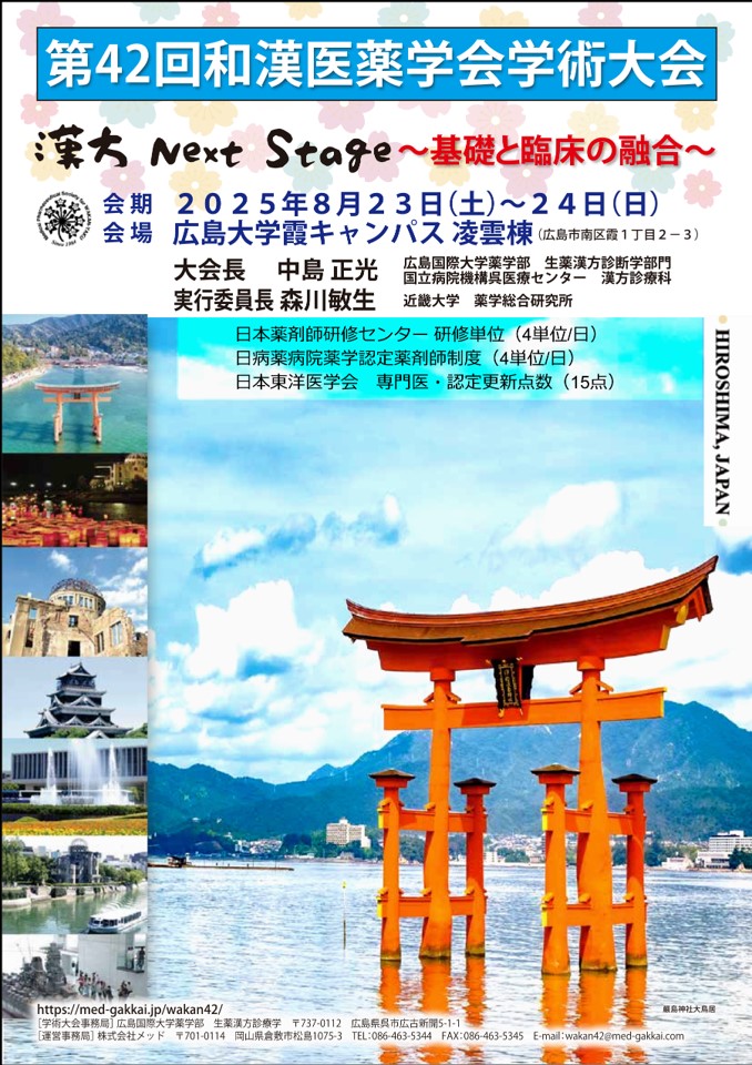 和漢医薬学会の理事長である広島国際大学薬学部生薬漢方診療学部門・国立病院機構呉医療センター漢方診療科の中島正光が大会会長として開催しました。実行委員長は近畿大学薬学総合研究所の森川敏生先生にお願い致しました。実行委員も素晴らしいメンバーで行います。会期は2025年8月23日(土)~24日(日)、広島大学霞キャンパス・凌雲棟(りょううんとう)で開催しました。メインテーマを 『漢方Next Stage』、そしてサブテーマを『基礎と臨床の融合』 とし、特別講演、シンポジウム、ワークショップ、教育講演、海外招待講演など、多数の企画で開催しました。本学会には3つの融合があります。伝統医学である漢方と現代医学の西洋医学の融合、基礎と臨床の融合、医師と薬剤師の融合の3つの融合があるユニークな学会です。