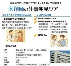 2025年10月4日(土)薬学部は、呉共済病院を会場に「薬剤師の仕事発見ツアー」を開催しました。本イベントは、呉共済病院・呉市薬剤師会との共催により、薬剤師の多様な役割と将来性を高校生に伝えることを目的とした初の取り組みです。