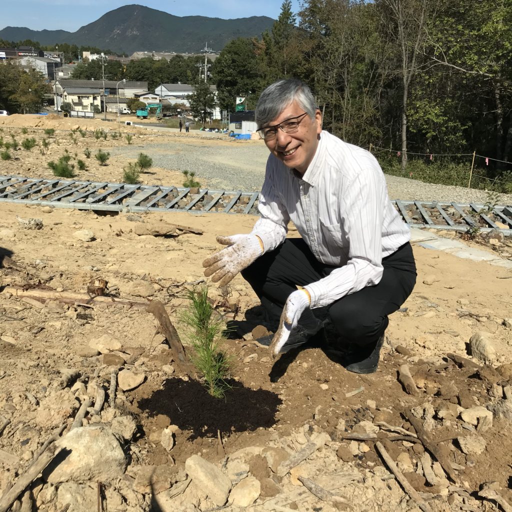 2018年の西日本豪雨では、本学の東広島キャンパスに隣接する前平山でも土砂崩れが起こり、5年以上経った今でも治山事業が進められています。それに伴い、地肌が露出して痛々しかったエリアも徐々に小さくなっています。その土砂崩れが起きたふもとの比較的平らな箇所に、林野庁の方のご指導のもと、害虫に強くスーパーマツと呼ばれるアカマツの苗木を約500本植えました。昨年に引き続いての植樹ボランティアです。