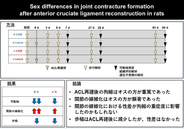 タイトル:Sex differences in joint contracture formation after anterior cruciate ligament reconstruction in rats(ラット前十字靭帯再建後の関節拘縮形成における性差)