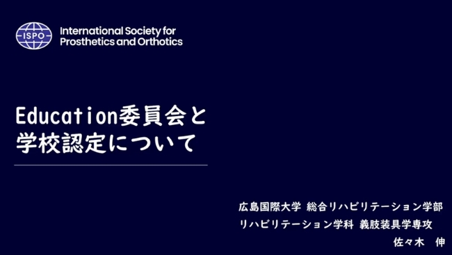 今回、佐々木教授は『2025年ISPO世界大会の報告&ISPOの動向と日本』というテーマで講演しました。ISPO本部理事(2025年~2029年)およびISPO日本支部会長(2025年11月で退任)として、これまでのISPOの活動、特に教育委員会委員および学校認証委員会委員長としての経験をもとに、世界と日本の義肢装具教育の比較や、日本の義肢装具教育の課題点を解説しました。