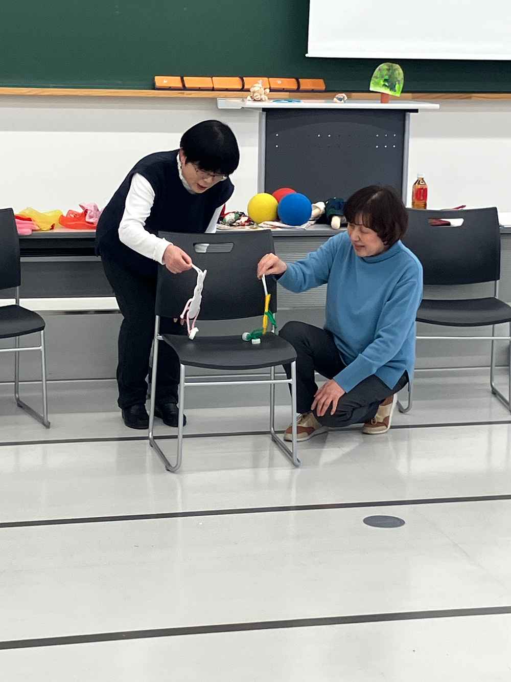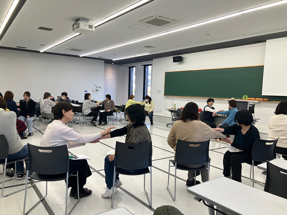 前半の講座では、講師の先生方とともに、実際に体を動かしながらわらべうた遊びを体験。参加者の皆さんからは「現場ですぐに子どもたちと実践したい」「発達状況に合わせた工夫が分かった」といった声が聞かれ、わらべうたの持つ力を改めて実感する時間となりました。