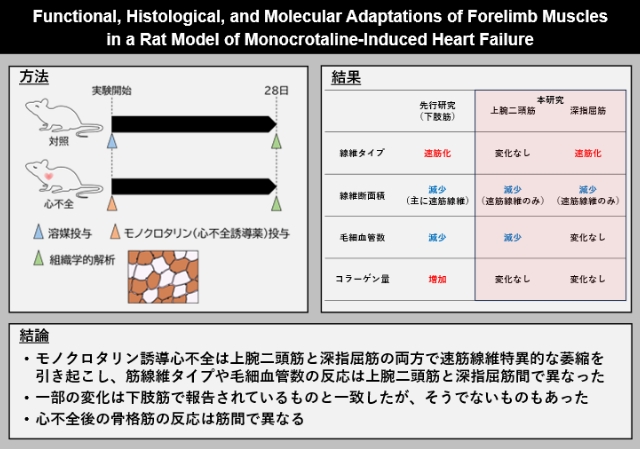 論文の概要:心不全患者で生じる骨格筋の変化は下肢筋では広く調べられており、速筋化、速筋線維優位な萎縮、毛細血管数減少やコラーゲン量増加などが報告されています。前肢筋の機能障害や筋量減少は心不全患者の予後に影響するにもかかわらず、上肢筋の組織学的変化はよく知られていません。本研究では、ラットモノクロタリン誘導心不全モデルを用いて、上肢(前肢)筋で生じる組織学的変化を調査しました。上腕二頭筋と深指屈筋の両方で速筋線維選択的な萎縮が観察されました。また、毛細血管数の減少は上腕二頭筋のみで生じ、筋線維タイプの変化(速筋化)は深指屈筋のみで生じました。いずれの筋でもコラーゲン量増加はみられませんでした。いくつかの変化は下肢筋で報告されているものと一致していましたが、そうでないものもあり、心不全に対する骨格筋の反応は筋間で一部異なることが示唆されます。そのため、下肢筋で報告されている変化がそのまま上肢の筋にも当てはまるわけではなさそうです。