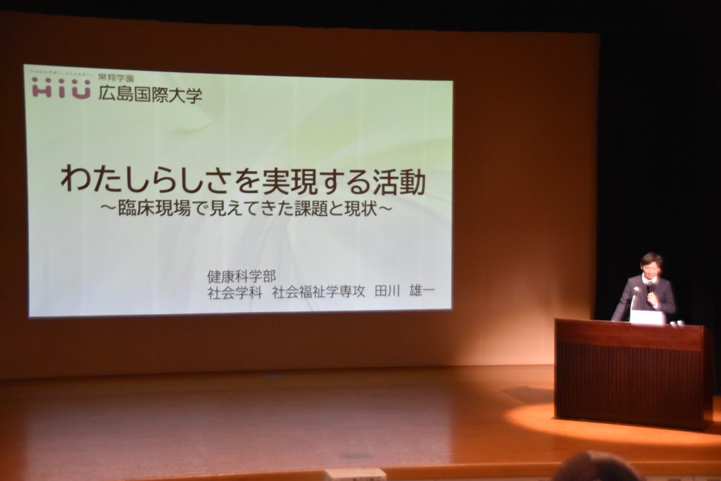 そして、健康科学部社会学科田川雄一講師の「わたしらしさを実現する活動~臨床現場でみえてきた課題と現状~」の講演では、難病患者・家族が抱える諸問題を医療・福祉専門職とともに考え、難病に対する理解を深めるとともに夢や希望を叶えるプロジェクト団体「Mebia」の活動について紹介がありました。