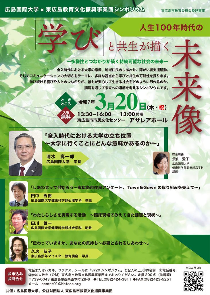 2025年3月20日(木・祝日)、「広島国際大学×東広島教育文化振興事業団」が主催するシンポジウムが東広島市市民文化センターアザレアホールで開催されました。