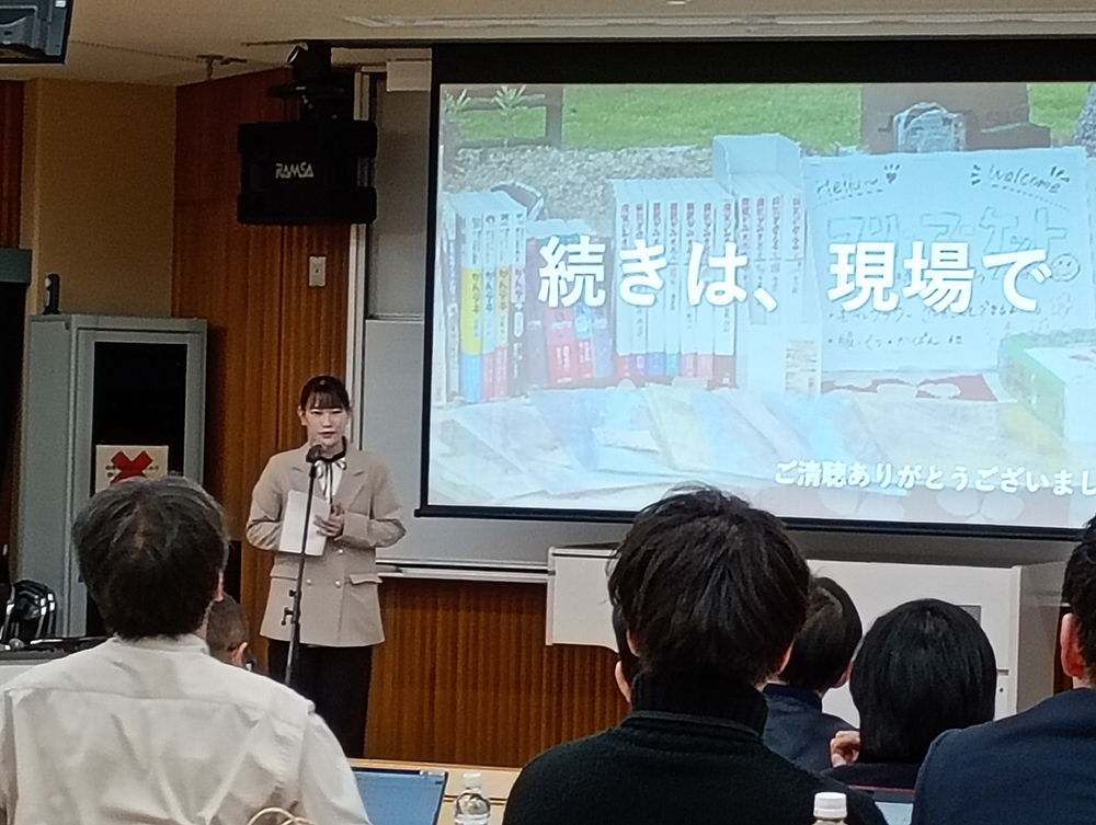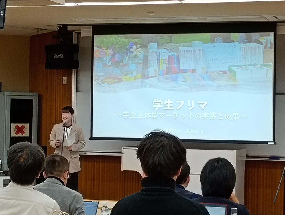 今年度は市内3大学から、11組から発表があり、本学からは、初崎朱李さん(看護学部看護学科)が「キャンパス発!学生と地域がつながるチャレンジフリマ」をテーマに、これまでの活動内容を発表されました。