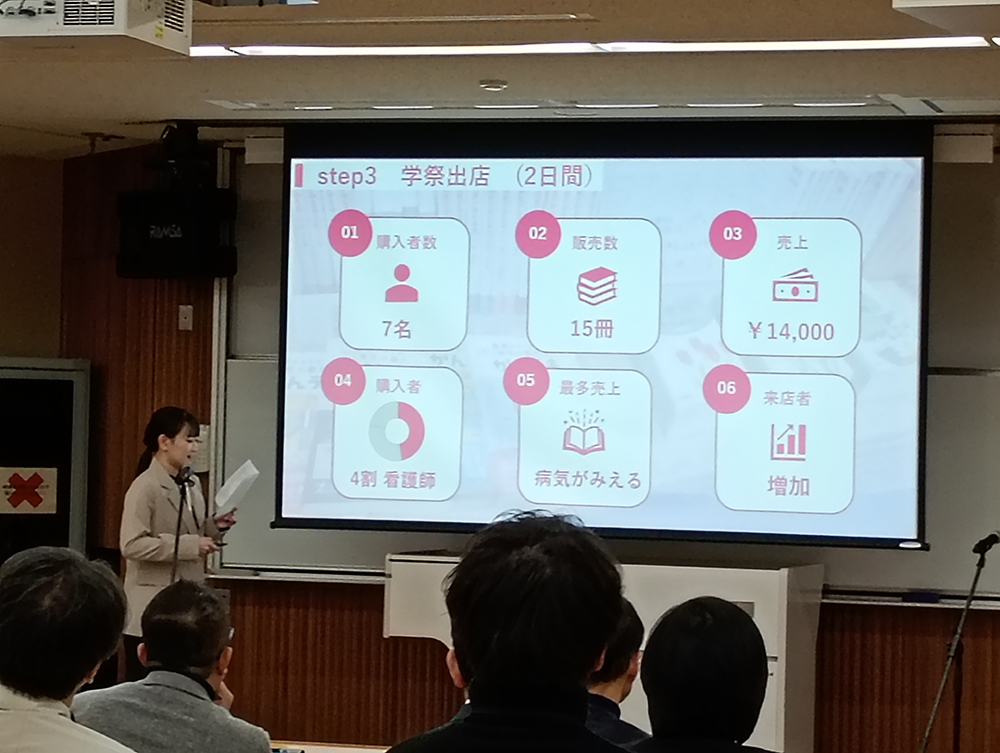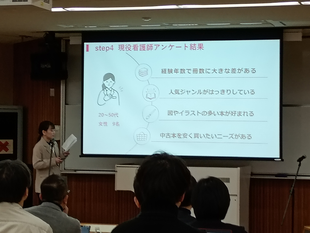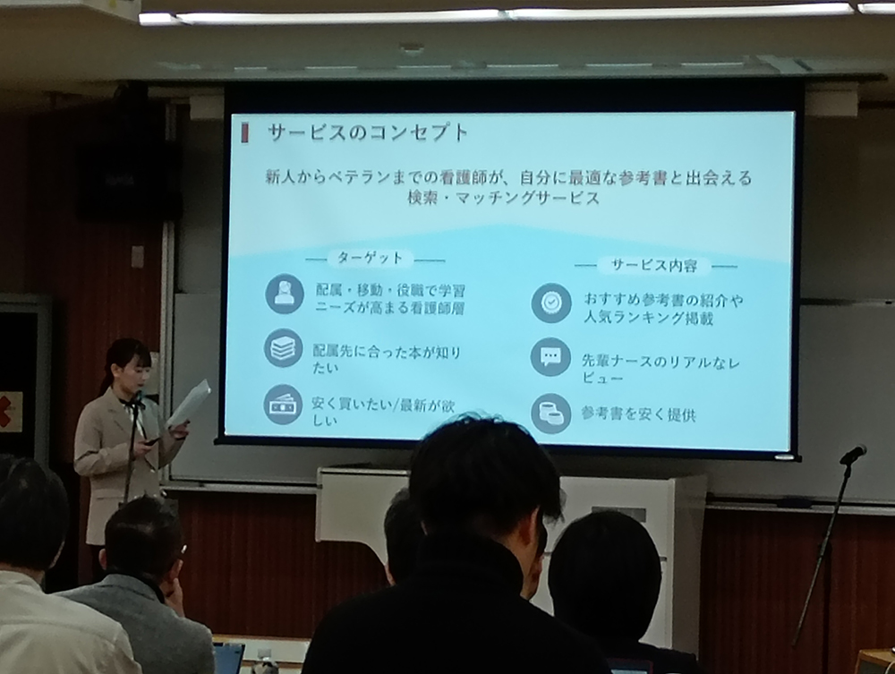 発表内容として、「私は、参考書が必要になるとフリマアプリを利用して入手していますが、送料・手数料が高いため、学内で格安で参考書を入手できないか、といった企画を考えました。今回の取り組みを行った結果、看護師が必要なニーズに特化したサービスが不足しており、学生より現役の看護師にニーズがあることがわかりました。また、取り組みを行う中でリアルなフリーマーケットからWEbでのマッチングに変更しました。今後の課題として、必要な参考書の供給が不足しているため、使っていない参考書を提供してもらうよう、学生等にアプローチが必要だと思います。利用者の学習ニーズにこたえるために、診療科や病院の規模、職務経験などのニーズで紹介できるような検索マッチングを作っていきたい。」とプレゼンテーションをされました。